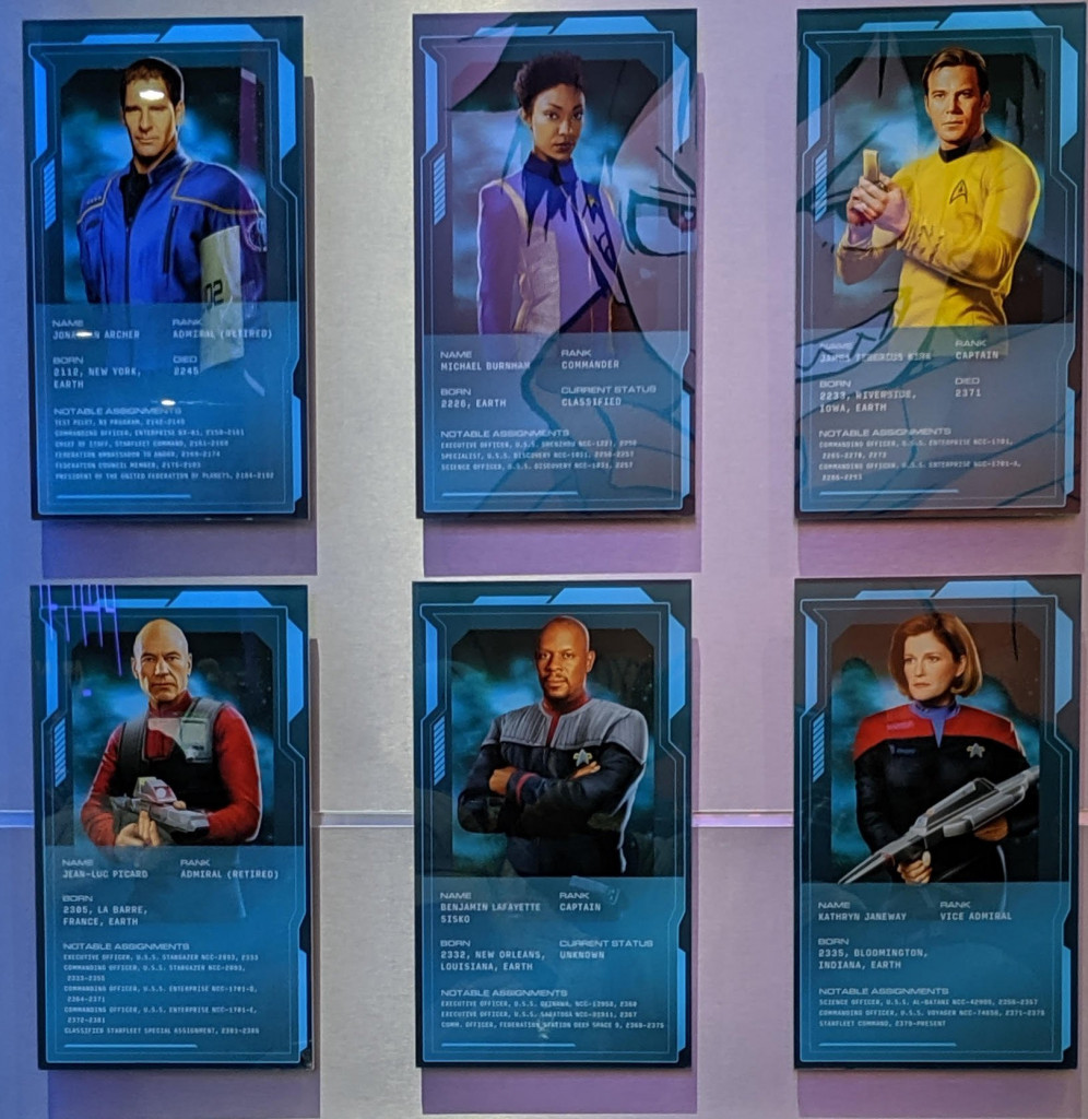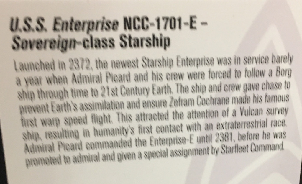 * Importante: tanto las descripciones de los perfiles, mapas y placas no son hechos considerados canon hasta que sean vistos en pantalla. Estos datos sirven como una guía, ya que fueron desarrollados por el mismo equipo creativo que se encuentra detrás de la serie, y son "la referencia canon" más concreta hasta el estreno de la serie. De acuerdo a algunas descripciones de perfiles que se vieron en el stand Star Trek Universe y en el museo de Starfleet (Jean-Luc Picard The First Duty), Picard aceptó ser promovido a almirante y dejó el comando del U.S.S. Enterprise-E en el año 2381, dos años después de los eventos en la película Star Trek Nemesis. En ese mismo año, el comandante Worf le entregó su bat'leth en agradecimiento. Según estas descripciones, Janeway todavía se encuentra sirviendo como vicealmirante en el Comando de Starfleet.