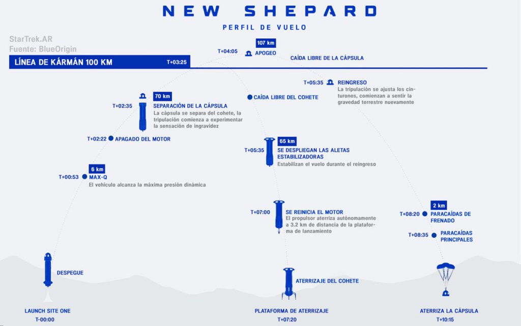 New Shepard tiene el objetivo de superar la línea de Kármán, reconocida internacionalmente como la división entre la atmósfera y el espacio exterior, la cual se sitúa a los 100 kilómetros de altura sobre el nivel del mar. El vuelo tiene una duración aproximada de diez minutos, desde el lanzamiento hasta el aterrizaje, en los que se experimentan al menos tres minutos de ingravidez.
